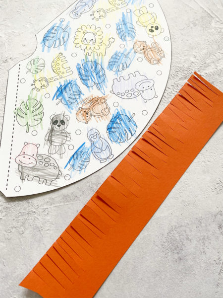 Anschließend schneidet ihr euch einen langen Papierstreifen in eurer Lieblingsfarbe aus. Er sollte ca. 5cm breit sein. Diesen Streifen schneidet ihr dann ganz oft, bis zur hälfte ein.